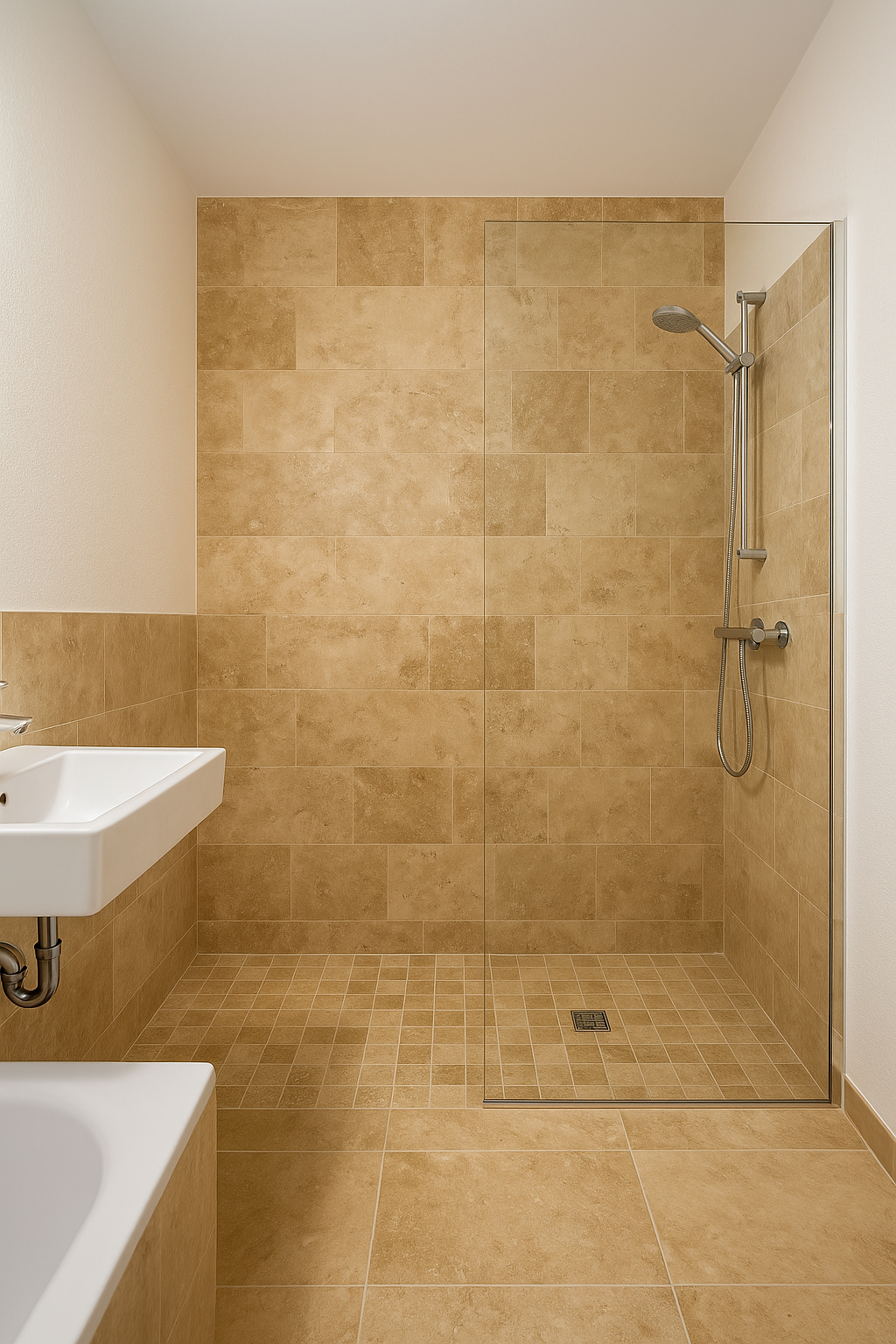 Aménagement d’une baignoire par une douche à l’italienne, pour un espace plus moderne, pratique et accessible, avec robinetterie encastrée et carrelage sur mesure.pour un meilleur rendement énergétique.